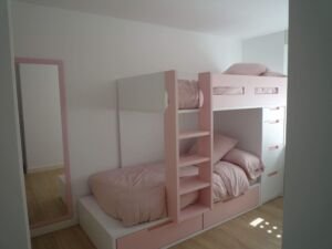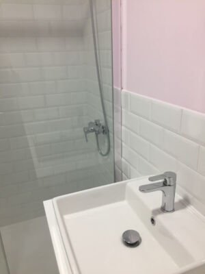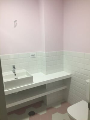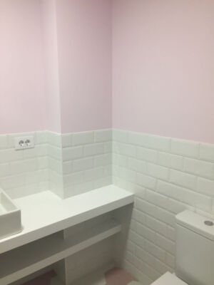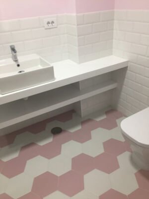 .-El baño de las niñas quería que fuese funcional y con un aire fresco y opte por el rosa empolvado y blanco haciendo combinación de damero en los suelos con ambos colores así como en las paredes quedando un baño cálido.