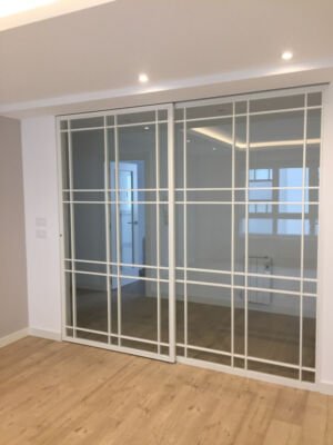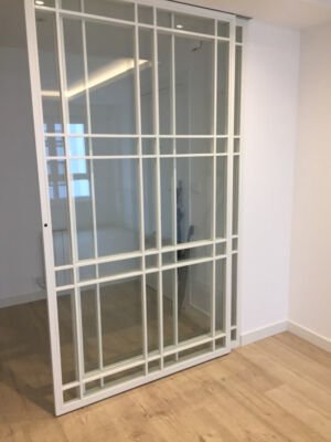 .-En el salón sustituí el tabique con una puerta de cristal que diseñe para este espacio el cual pasa a unificar los espacios además de aislar el ruido